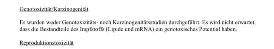 Comirnaty von Pfizer/BioNTech, sowie die anderen sog. Covid-19-„Impfstoffe“ sind, wie direkt aus der Zulassungsdokumentation hervorgeht, u.a. niemals auf ihre Genotoxizität, Karzinogenität und Mutagenität geprüft worden, weil man annahm, dass diese experimentellen Substanzen diesbezüglich keine Risiken bergen würden!