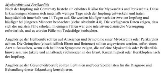 Aus der aktuellen Fachinformation der EMA/Europäischen Kommission (und von AIFA übernommen) zu Comirnaty von Pfizer/BioNTech geht ausdrücklich hervor, dass die auf mod.RNA-Basis beruhende Substanz zu einer Herzmuskelentzündung auch mit Todesfolge führen kann.