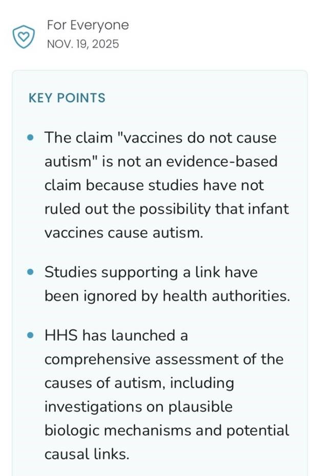 Das CDC (Centers for Disease Control and Prevention – die führende US-Bundesgesundheitsbehörde) erklärt seit 19.11.2025 offiziell auf seiner website, dass die Kinderimpfungen als Ursache des Autismus nicht ausgeschlossen werden können, und begeht damit eine längst überfällige Kehrtwende in seiner Position!