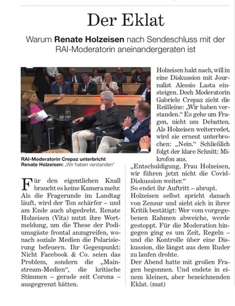 betreffend meiner Wortmeldung zur äußerst fragwürdigen Rolle der Systemmedien für die Polarisierung in der Bevölkerung (siehe hier den betreffenden Ausschnitt der RAI Südtirol Sendung https://youtu.be/RVr1dHMuQzY?is=d1ot7d1iF_9e6Bb )