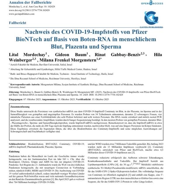 Eine neue israelische Studie (Wissenschaflterteam renomierter Universitäten Israels) bestätigt das Vorhandensein der Impf-RNA in der Plazenta, im Sperma, in der Samenflüssigkeit und im Blut auch viele Monate nach der „Verimpfung“ des in Israel massiv eingesetzten Covid-19-„Impfstoffes“ von Pfizer (Comirnaty).