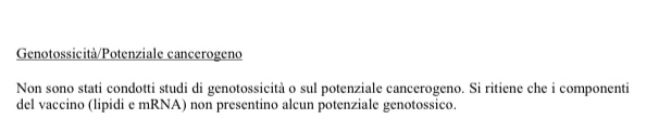 Comirnaty di Pfizer/BioNTech, così come gli altri cosiddetti “vaccini” Covid-19, per quanto risulta direttamente dalla documentazione di autorizzazione, non sono mai stati testati, tra l’altro, in punto genotossicità, cancerogenicità e mutagenicità, perché si presumeva che queste sostanze sperimentali non comportassero rischi in tal senso!
