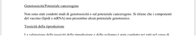 ” …. Si prega di notare che il richiedente dell’autorizzazione di Comirnaty non ha presentato studi di genotossicità o cancerogenicità, in quanto i componenti della formulazione del vaccino sono lipidi e RNA che non dovrebbero avere un potenziale genotossico. …. Gli studi di genotossicità o di cancerogenicità non sono di solito necessari per la formulazione finale del vaccino e quindi non vengono normalmente richiesti al richiedente. Ciò è in linea con le due linee guida dell’OMS sulla valutazione non clinica dei vaccini (OMS 2005, OMS 2013).”