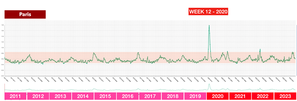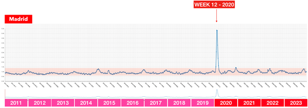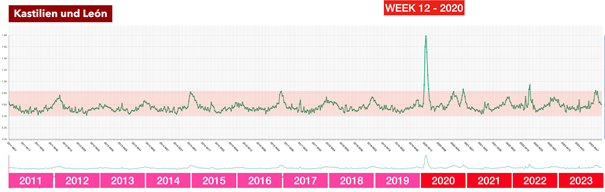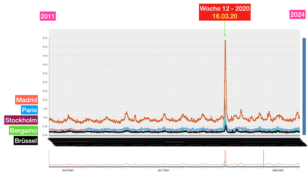 Besonders brisant ist, dass Bergamo kein Einzelfall ist. In Madrid, Paris, dem Elsass und in Kastilien und León zeigen sich nahezu zeitgleich in Kalenderwoche 12 des Jahres 2020 ähnliche Muster: kurze, extreme Sterbepeaks, die sich nicht in länger anhaltende Wellen fortsetzen.