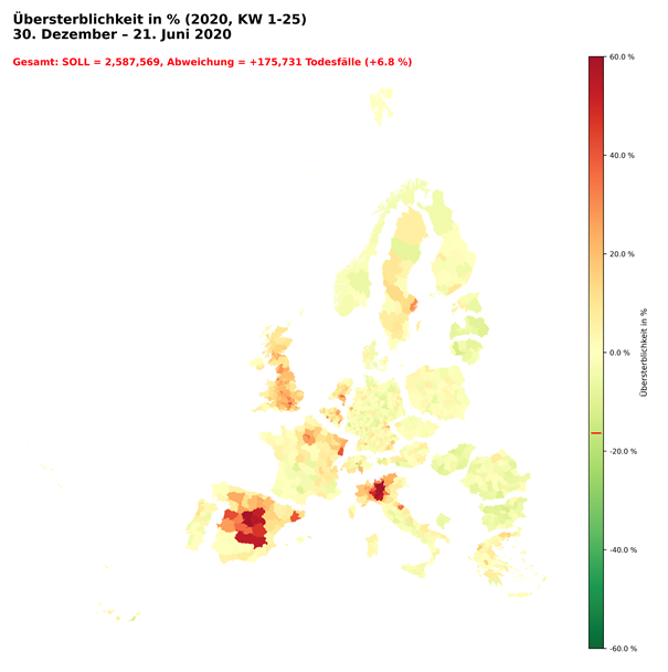 Da die Darstellung das erste Halbjahr 2020 umfasst, wird deutlich, dass diese extremen Übersterblichkeitscluster auf einen sehr kurzen Zeitraum innerhalb weniger Wochen zurückgehen und nicht das Ergebnis eines dauerhaft erhöhten Sterbegeschehens über Monate hinweg sind.